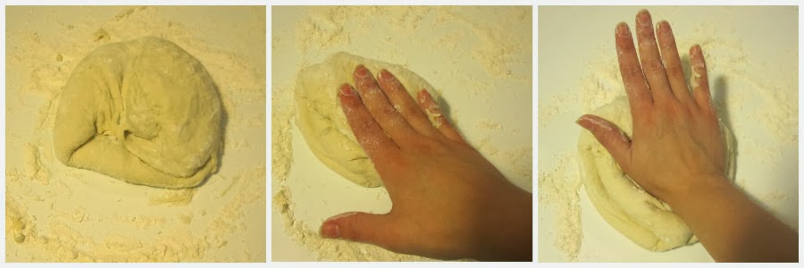 4. Cuando se hayan integrado bien los ingredientes, seguimos amasando a mano. Para ello, limpia bien la encimera, esparce un poco de harina sobre ella y empieza a amasar. Si ves que está muy pegajosa, ve echándole un poquito de harina hasta que la masa se quede como plastilina. Para amasar, como intento mostrar en la imagen, ve doblando sobre si misma la masa y después presiona para volver a juntarla. Sigue así durante un rato. Hay que amasar unos 15 minutos aprox.