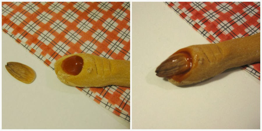 7. A continuación viene la parte divertida... Coge una de las bolitas, amásala un poquito y dale forma alargada. Yo he hecho unos dedos largos, aunque podrían salir dos más cortitos de cada uno de los que yo he hecho. Después "clava" o hunde una almendra para hacer la uña. Puedes utilizar toda la almendra o, como en mi caso, cada una de las almendras las he separado en dos caras. Por último con un cuchillo hazle las rayitas de los nudillos.