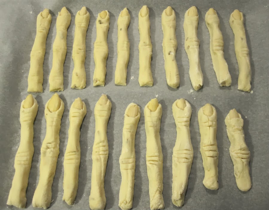 8. Prepara una bandeja de horno donde pondrás papel vegetal y sobre él ve colocando los asquerosos dedos de bruja. Después, con el horno a 200º, mete la bandeja a media altura y debajo pon el bol (tipo pirex) con agua. Ésto hará que salgan crujientes. Tendrán que estar unos 40 min. aproximadamente o hasta que estén doraditos. Vigila que no se quemen.