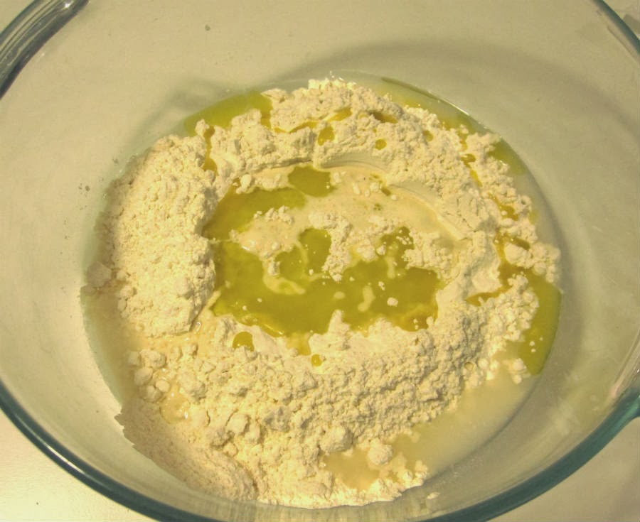 2. En un cuenco grande pon la harina, el agua con la levadura, el aceite de oliva y la sal.