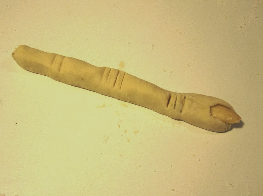 7. A continuación viene la parte divertida... Coge una de las bolitas, amásala un poquito y dale forma alargada. Yo he hecho unos dedos largos, aunque podrían salir dos más cortitos de cada uno de los que yo he hecho. Después "clava" o hunde una almendra para hacer la uña. Puedes utilizar toda la almendra o, como en mi caso, cada una de las almendras las he separado en dos caras. Por último con un cuchillo hazle las rayitas de los nudillos.
