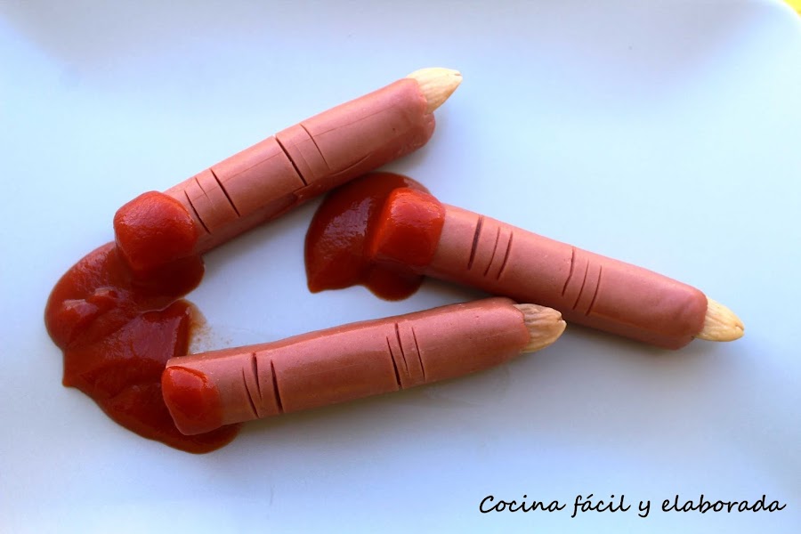 Segunda entrega de las recetas supersencillas para la noche de Halloween. Esta es tan fácil que no vais a tardar más de dos o tres minutos en prepararla. Con solo 3 ingredientes tenéis una receta para asustar a todos los comensales, jeje. Hoy os traigo unos dedos de bruja que se hacen con salchichas, tomate frito y unas almendras tostadas, más fácil imposible. Esta receta se la dedico a mi sobrino Juan.