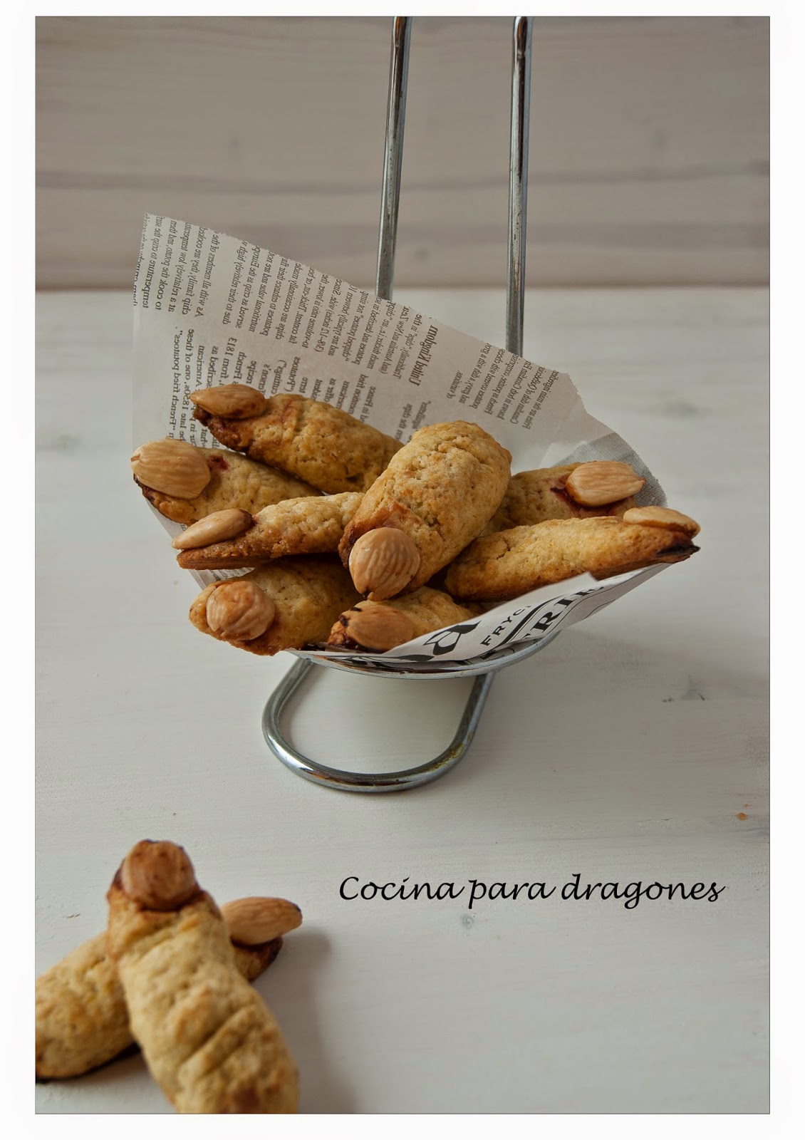 4) Ponemos un poco de mermelada en ambas puntas para simular la sangre y, en la punta, ponemos una almendra para que haga de uña.