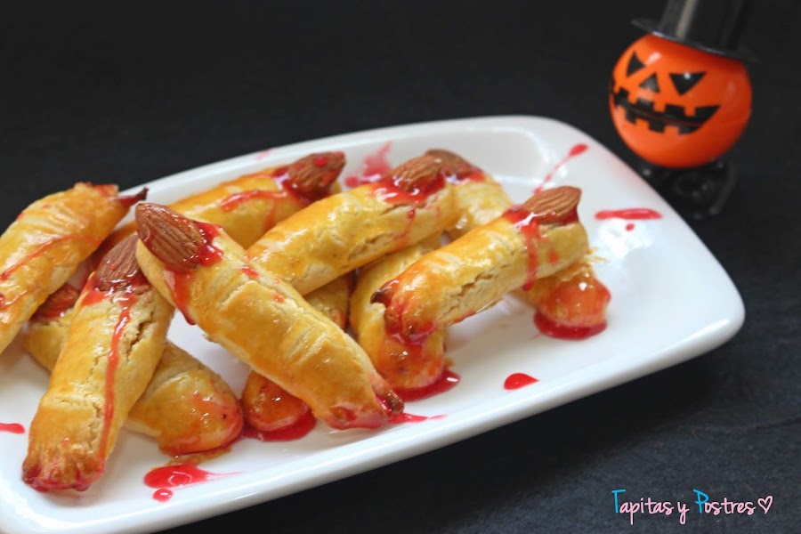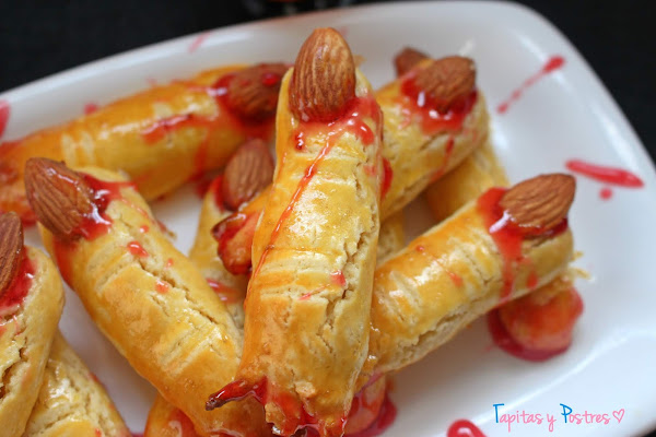Este año para Halloween he elegido una receta que anda circulando por la red desde hace mucho tiempo. Son los famosos "dedos de bruja", que no son más que unas riquísimas galletas de mantequilla que adornadas convenientemente dan la impresión de tener unos terroríficos dedos ensangrentados.
