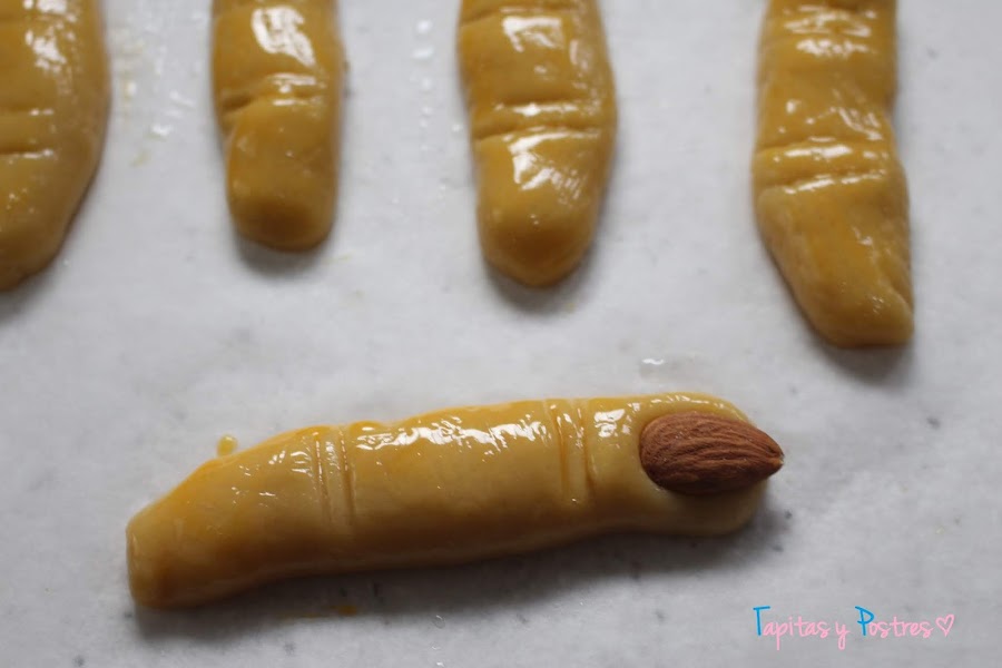 Pasado el tiempo, cogemos porciones de masa, hacemos un churrito de unos 8 centímetros, damos forma de dedo y marcamos los nudillos con un cuchillo. Pintamos con la yema de huevo y ponemos una almendra en un extremo, simulando una uña.