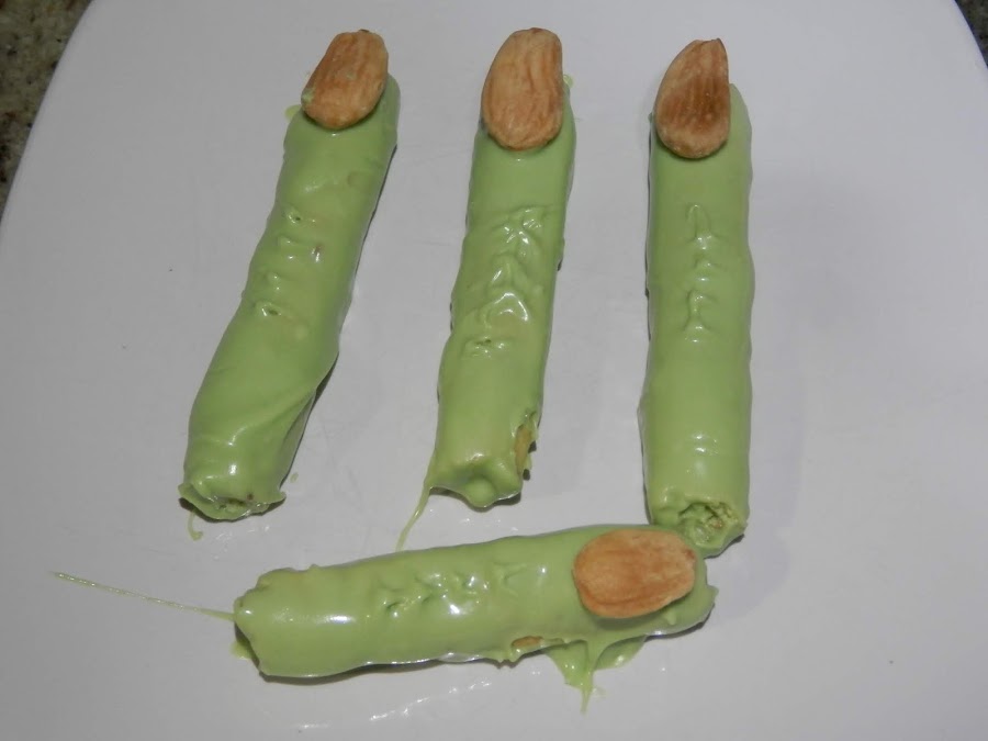 Ahora, baña los trocitos de pan y pon en un extremo una almendra a modo de uña.