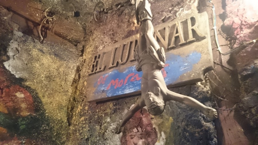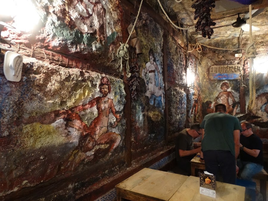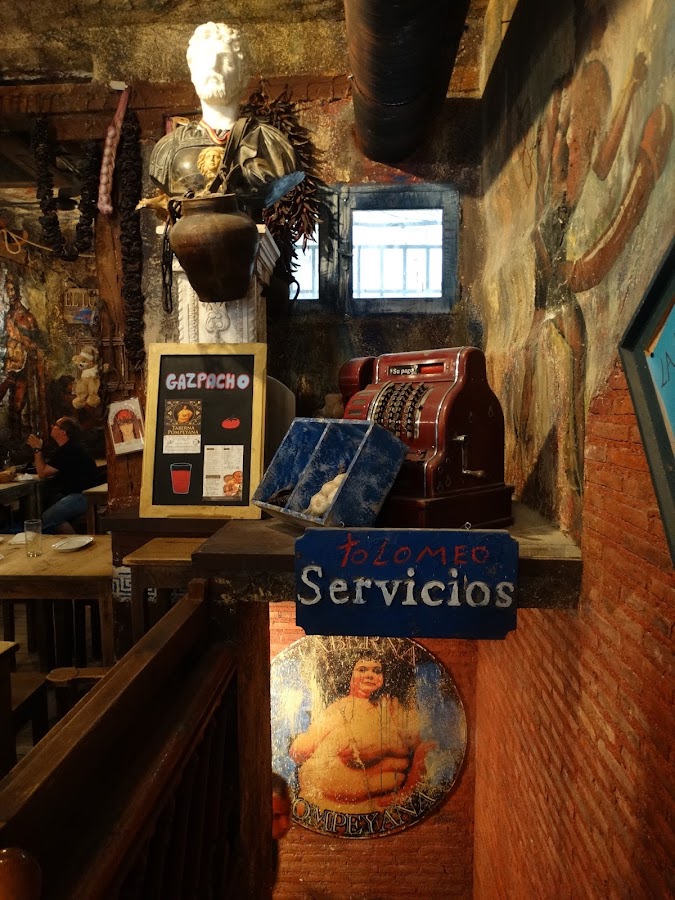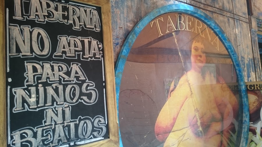 Tras salir de La tía Cebolla, seguimos caminando por el callejón de Álvarez Gato (Número 5) hasta toparnos de bruces con un lugar peculiar. Su fachada rocambolesca, de maderas trilladas, colores gastados, y con una oronda mujer desnuda mirándote con ojos entre cómicos y viciosos. Te pica la curiosidad y no puedes resistir la tentación de adentrarte en La Taberna Pompeyana.