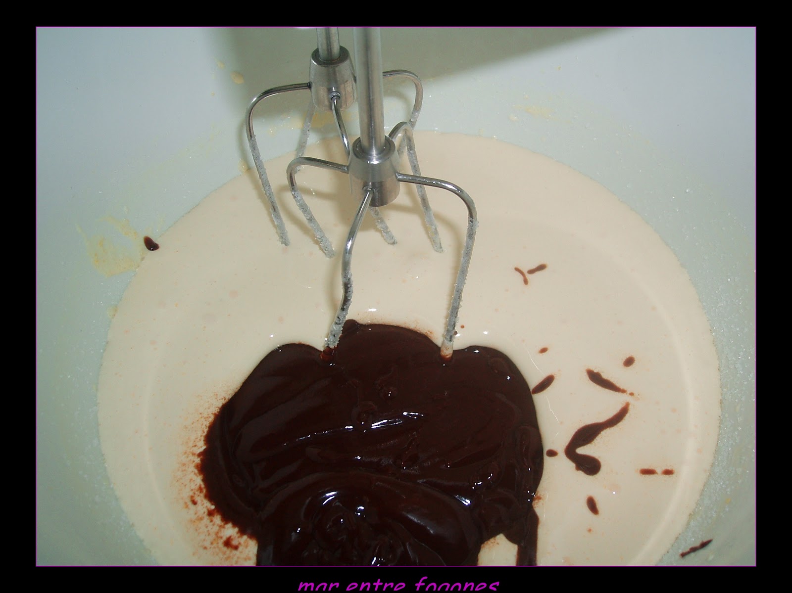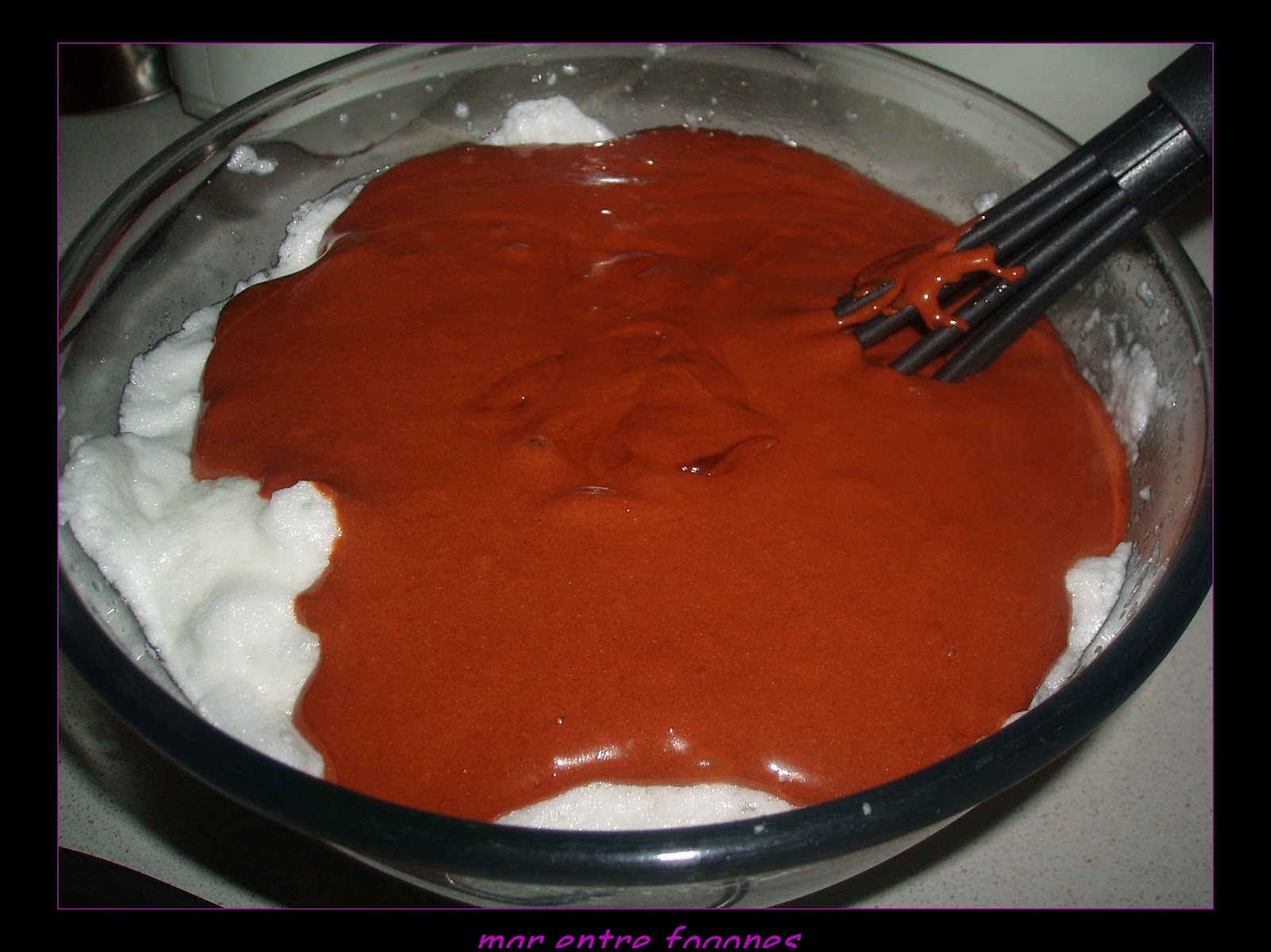 Añadir el chocolate y la mantequilla bien mezclado a las yemas y el azucar.