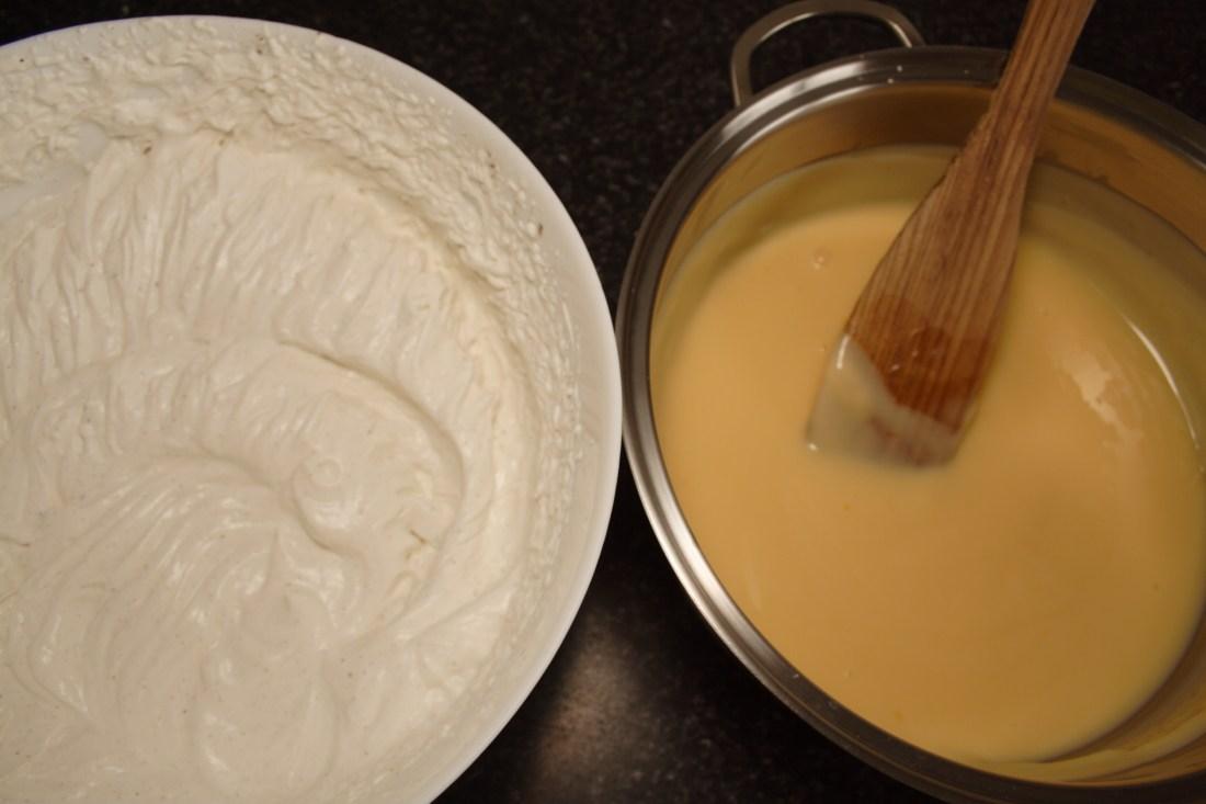 Sacamos el bol de nata (crema de leche) de la nevera, retiramos el hielo, secamos el bol, vertemos la nata (crema de leche), los 30 gr de azúcar y la vainilla. Montamos con una batidora de varillas y mezclamos con la crema, despacio y con movimientos envolventes.