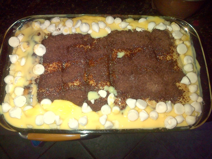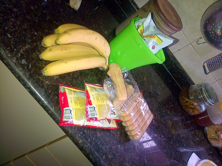 Agregué un poco del postre ya preparado y acomodé la vainillas en un recipiente rectangular de vidrio. las rocié con otro poquito de postre. Esperé que se "bebieran el postre". JAJAJA....