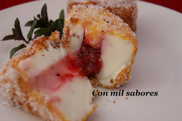 Al día siguiente, cuando haya cuajado lo suficiente la poleá la desmoldaremos con cuidado y con un sacacorazón de frutas extraeremos con cuidado la parte central dejando un hueco que podremos rellenar. Añadimos las fresas preparadas el día anterior en el hueco que hemos habilitado y taparemos por encima con "un trocito" de poleás del que extraímos con el sacacorazones, a modo de tapadera para que no se salga el relleno al freírlo.
