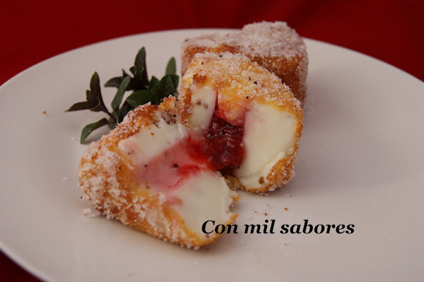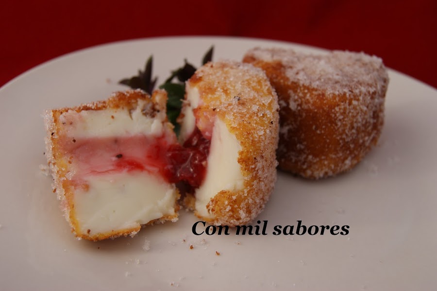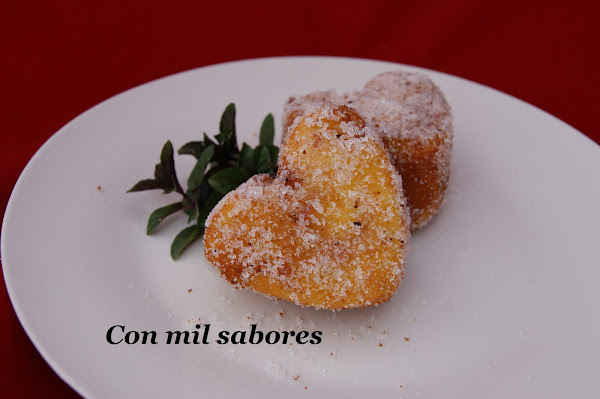 Pasamos las porciones en primer lugar por harina, después por huevo batido y finalmente por un fino pan rallado, las freímos en aceite de girasol caliente y las colocamos sobre papel de cocina para quitar el aceite sobrante. las emborrizamos en azúcar y las servimos templadas.