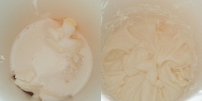 5. - En un vaso batidor echamos el queso, el azúcar y la nata (crema de leche) y batimos con unas varillas hasta que monten y queden consistente.