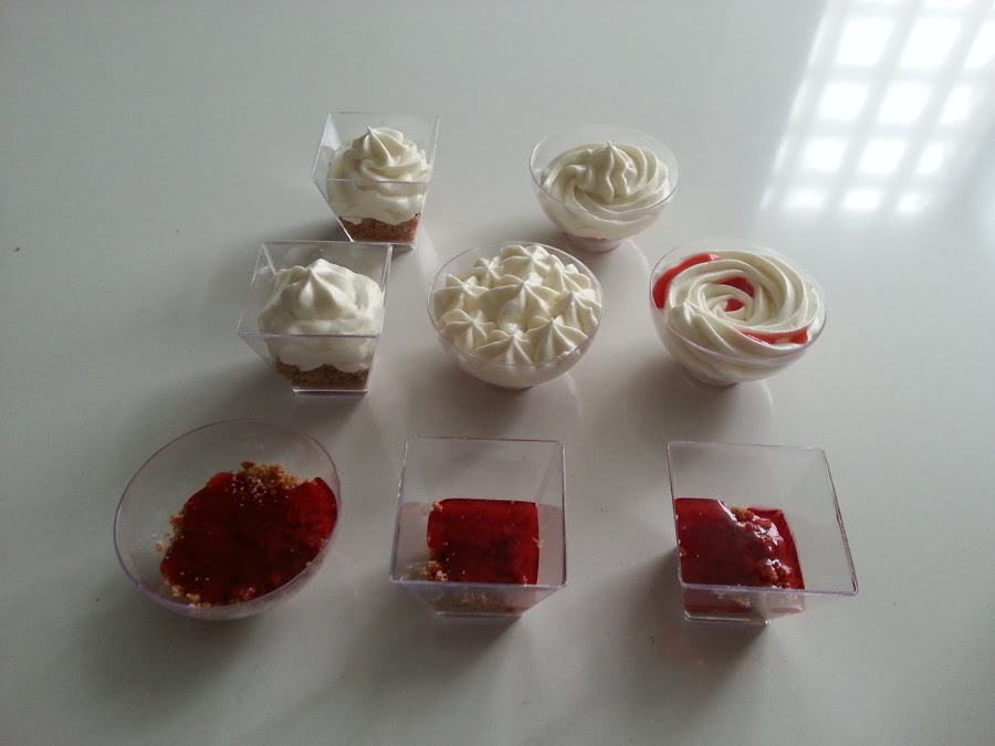 7. - Y decoramos con las frutas y el sirope a nuestro gusto, yo a algunas le puse el sirope sobre la galleta y otras sobre la mezcla de queso.