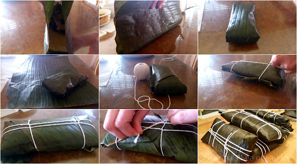 Una vez tengamos todos los ingredientes colocados, unimos los extremos de la hoja paralelos a nosotr@s, doblamos 2 veces y presionamos. Terminamos doblando los extremos que faltan. Luego colocamos otro trozo de hoja y envolvemos la hallaca pero esta vez en diagonal. Por último y no siempre necesario, colocamos un trozo más estrecho de hoja y envolvemos en el centro, como si de una faja se tratase. Ahora amarra el paquetito resultante con pabilo o hilo para atar carnes y listo.
