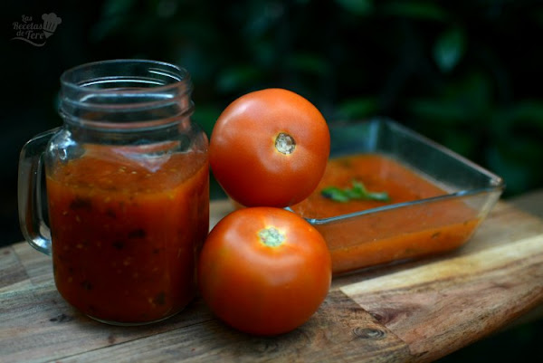 Escalda los tomates, házles una cruz en la parte superior a cada uno de ellos y mete a hervir unos minutos, sácalos del agua caliente y quítales la piel con facilidad. Corta cada uno en cuadros, monta una olla con la taza de agua, los ajos enteros, y los tomates, cocina aproximadamente por 20 minutos hasta que los tomates se deshagan, añade la hierbabuena, el orégano y la sal, calienta unos 15 minutos más. Saca los ajos enteros y tritura con la mini pymer . Si ves, que está muy espesa, agrega un poco más de agua, rectifica la sal y añade pimienta negra, si quieres.