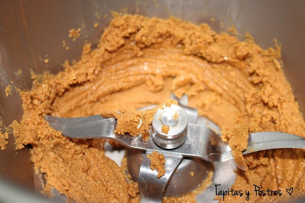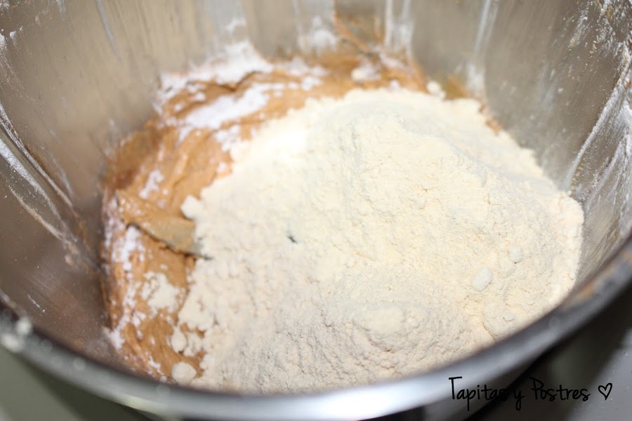 Añadimos los 250 gr de harina tostada y mezclamos 30 segundos a velocidad 5. Debe quedar una pasta brillante y no muy pegajosa. Si está difícil de manejar la sacamos sobre la encimera con algo de la harina extra que habíamos tostado y amasamos añadiendo más harina hasta que sean una masa lisa y nada pegajosa (para esto queríamos la harina extra).