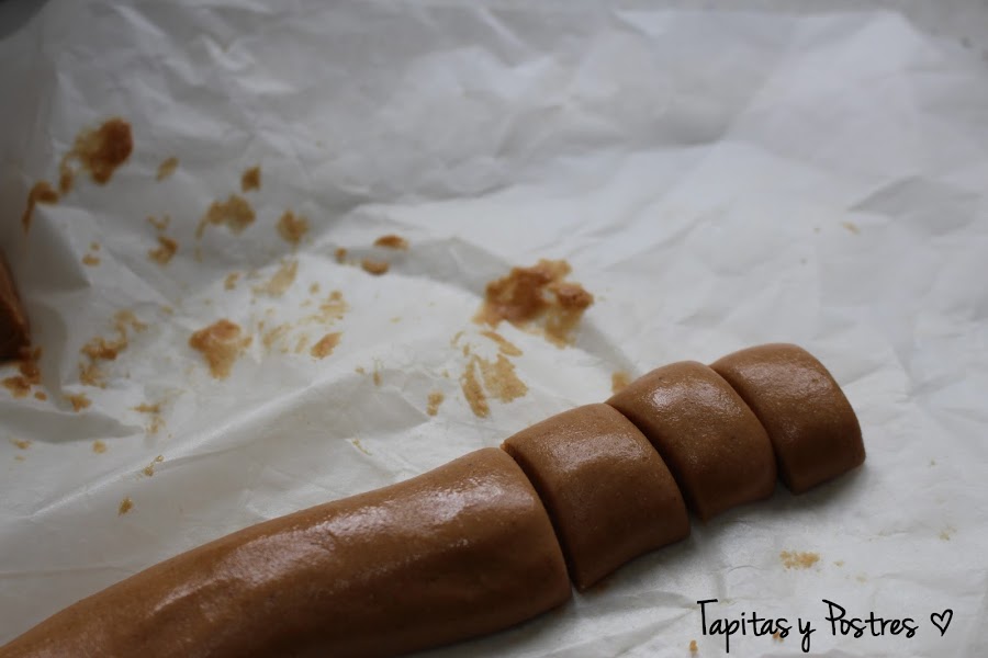 Cogemos porciones y hacemos rulos de unos tres centímetros de grosor y cortamos porciones mas o menos iguales.