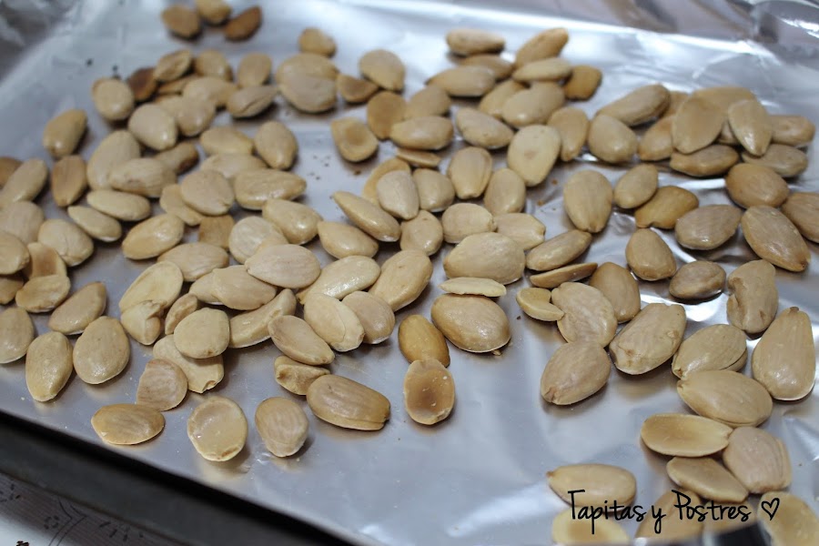 Para elaborar estas deliciosas de almendras, primero vamos a tostar las almendras crudas, las pondremos en una fuente de horno y las doraremos unos 6 o 7 minutos a 180º. Sacamos y dejamos enfriar.