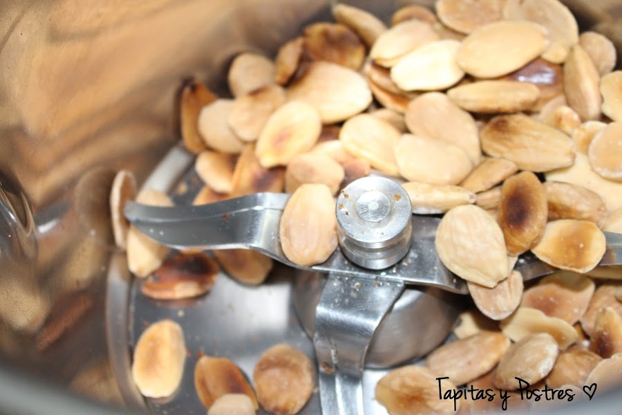 En el vaso de la thermomix trituramos las almendras 10 segundos a velocidad 7-9. Lo hacemos varias veces hasta que salga el aceite de la almendra y se forme una pasta.