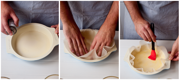 - Colocamos una lámina brick y la pincelamos con mantequilla fundida. Deben sobresalir los bordes por fuera del molde.