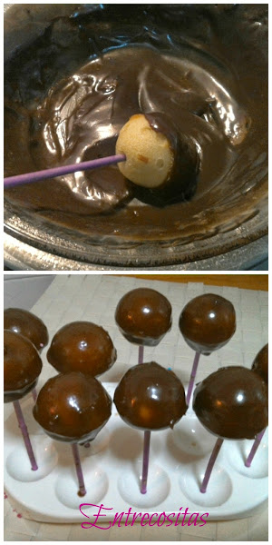 Una vez fríos, pincharles un palito para poder bañarlos en chocolate derretido. y dejarlos enfriar.