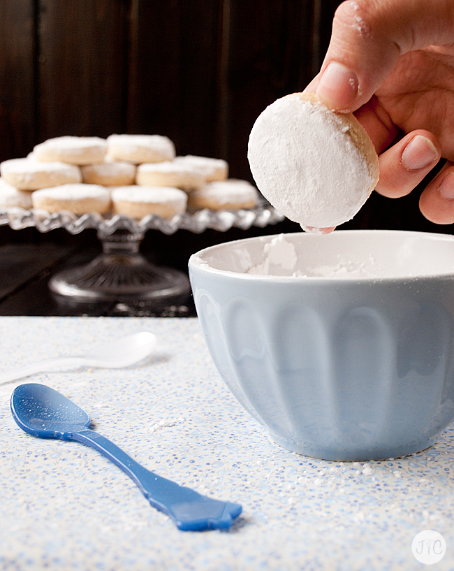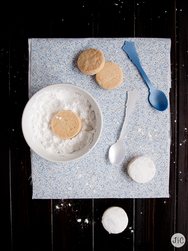 - Toca bañarlos en azúcar glacé. Yo lo he he hecho ha sido pintar ligeramente la superficie con un poco de agua (solo la parte de arriba) para que se adhiera bien el azúcar y se forme una capa lisa de azúcar. Entonces introducimos los nevaditos en un bol con azúcar glacé para que se adhiera bien el azúcar. Yo he pretado bien cada uno contra el azúcar para que salgan más o menos lisos.