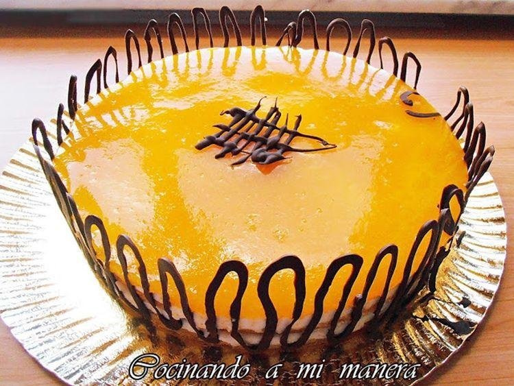 ¡Que pinta! Estoy seguro que os animaréis a preparar esta rica tarta de Cocinando a mi manera. Vamos a comenzar haciendo un bizcocho, batimos huevos con azúcar hasta que doblen su volumen, le incorporamos harina, maicena y levadura y lo metemos en un molde y al horno durante 20 minutos a 180ºC, y reservamos. Preparamos el relleno montando claras a punto de nieve y nata (crema de leche), trituramos unos melocotones en almíbar ya escurridos; el almíbar nos servirá para mojar el bizcocho; y los mezclamos con queso crema, yogur griego y azúcar. Hidratamos unas hojas de gelatina y las disolvemos en zumo de melocotón caliente y se lo añadimos a la mezcla anterior, por último le incorporamos la nata montada (crema de leche) y las claras. Mojamos el bizcocho partido a la mitad con el almíbar reservado y lo rellenamos con esta crema, tapamos con bizcocho mojado y cubrimos con el resto de esta crema. Dejamos que cuaje durante al menos 4 horas en el frio, Cubriremos la tarta con una mermelada de melocotón con hojas de gelatina disueltas en zumo de melocotón. Y decoramos con chocolate.