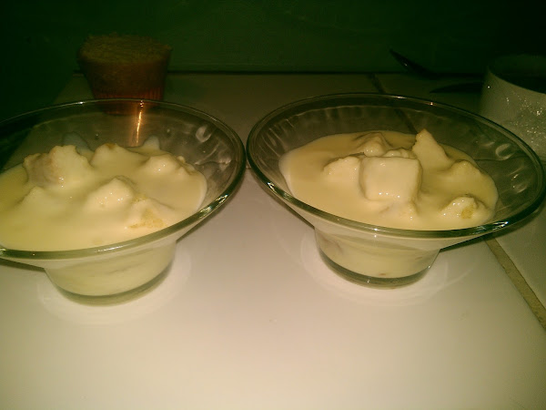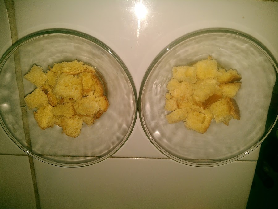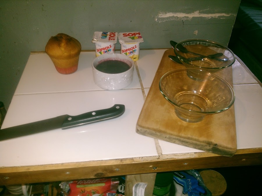 Cortar en cuadrados el queque o muffin y distribuir en los pocillos, agregar el yogur sobre estos.