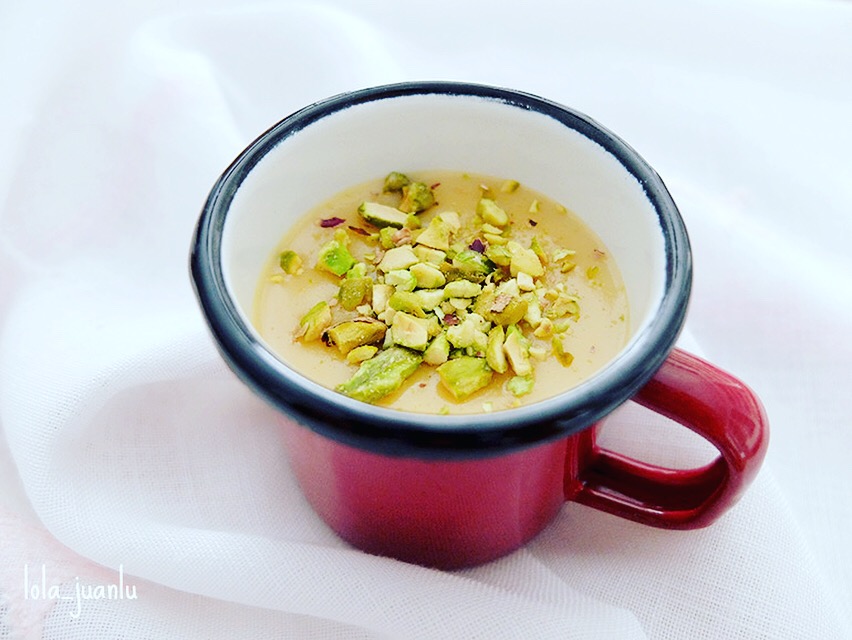 Vertemos el chocolate en una tacita y espolvoreamos un poco de pistachos triturados. El pistacho le aporta textura rompiendo la monotonía de color.