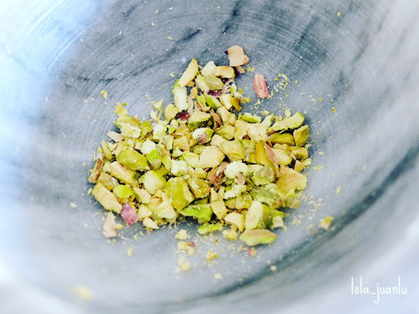 Pelamos los pistachos y los machacamos con la ayuda de un mortero.