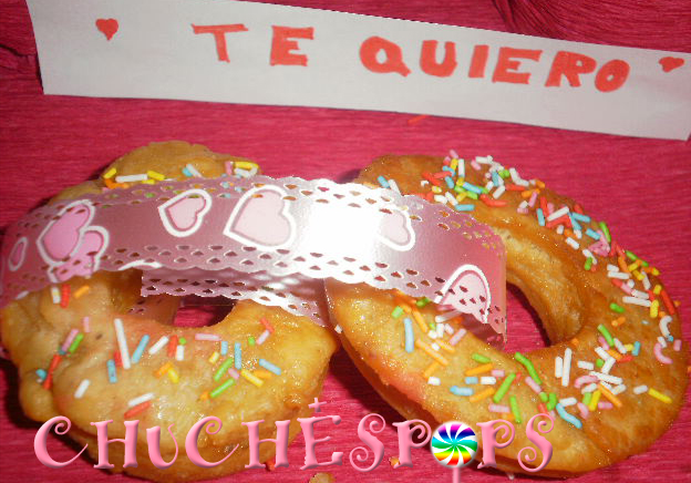 4º He cubierto los donuts de chocolate blanco al que le he puesto colorante rojo y unos sprinkles de corazones, después los he unido con la cinta de corazones de los vasos- Así queda más romántico.