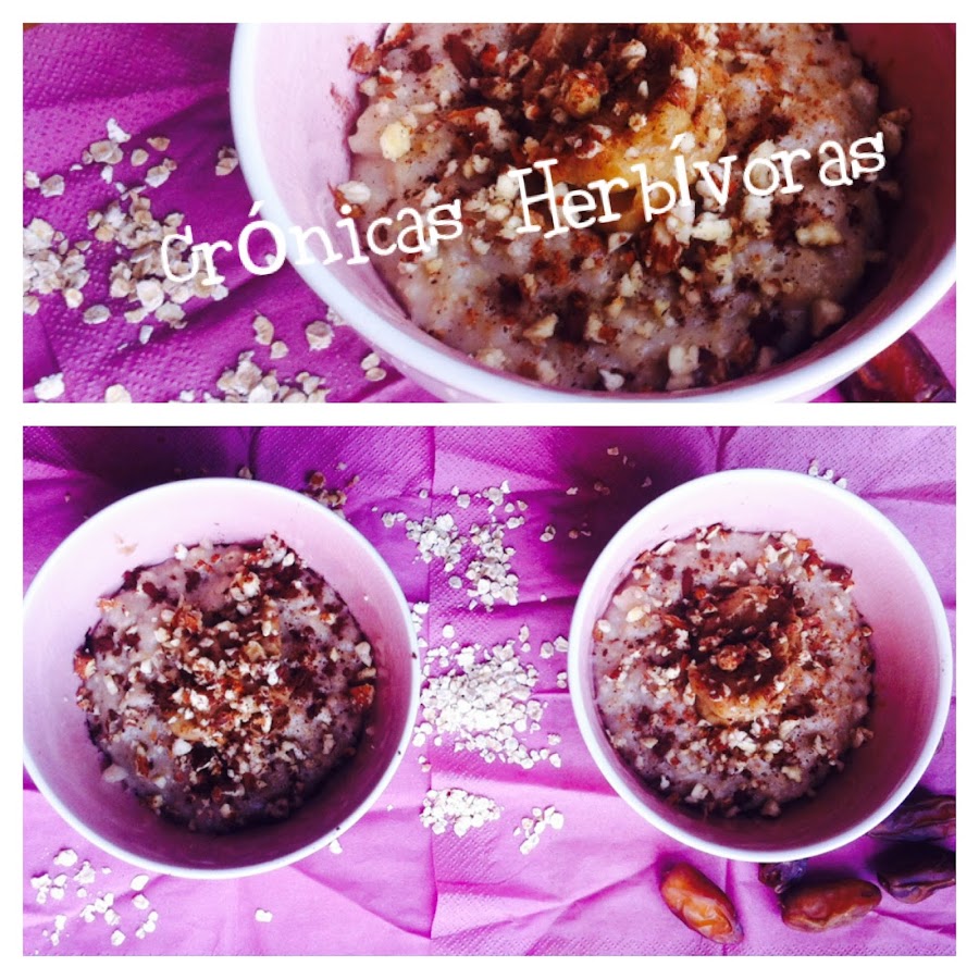 Sirve calentito en unos boles y ponle encima una cucharada de caramelo de dátil. Espolvorea con la almendra molida, más canela si quieres y un poquito de cacao.