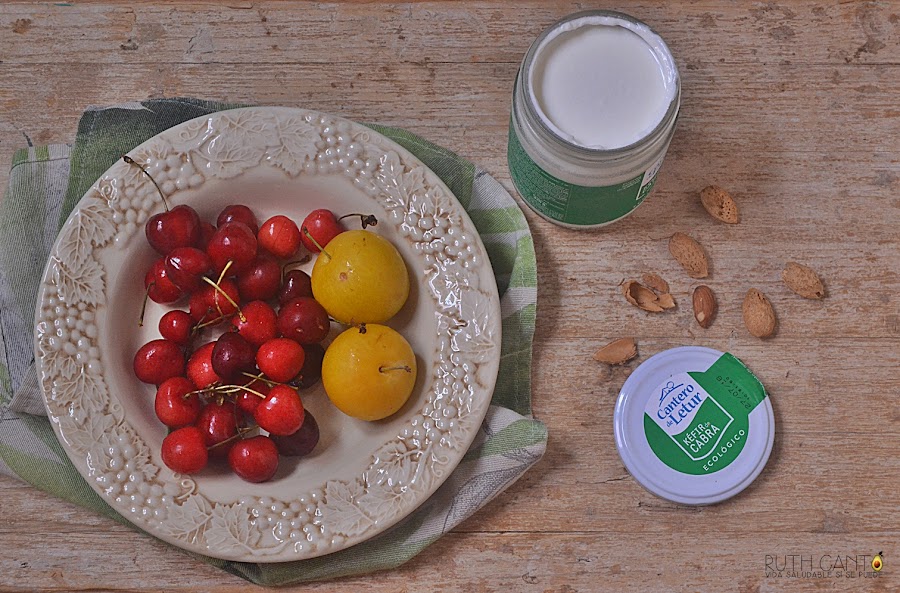 Yo hoy he tomado unas cerezas y unas ciruelas amarillas, locales, no pueden estar mas buenas, acompañadas de un vaso de kéfir ecológico de cabra, personalmente no le echo nada, es cuestión de reeducar al paladar. También en el desayuno, incluyo frutos secos, almendras o nueces o avellanas, pero unos poquitos ja ja , lo sé , son puro vicio a cualquier hora.