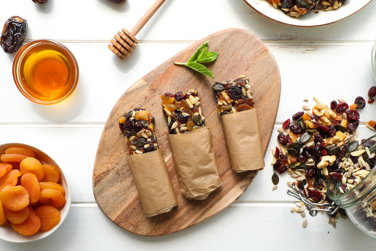Barritas energéticas de frutos secos: ¡Otro snack delicioso para picar entre horas! Primero trituramos el mix de Frutos Secos Florette junto a unas frutas pasas, añadimos miel para lograr una mezcla homogénea. Vertemos la mezcla en un bol cuadrado sobre papel de horno, dejamos que se asiente y finalmente desmoldamos y cortamos al gusto. ¡Fácil y delicioso!