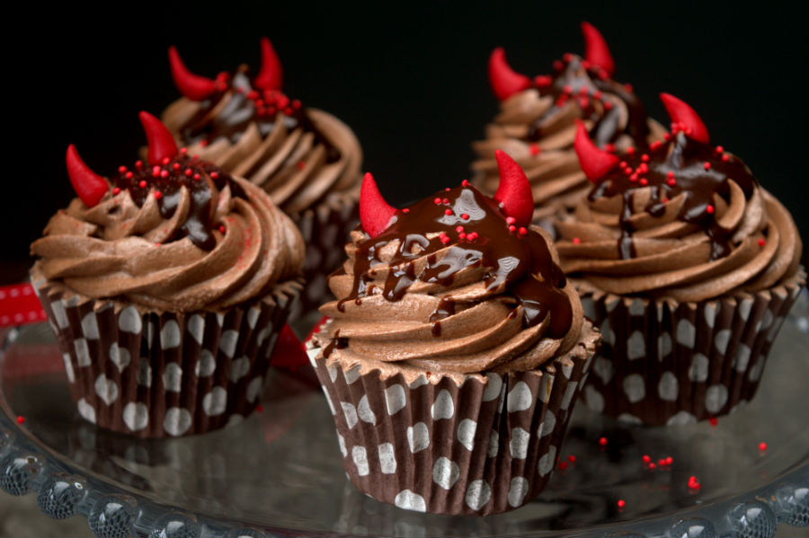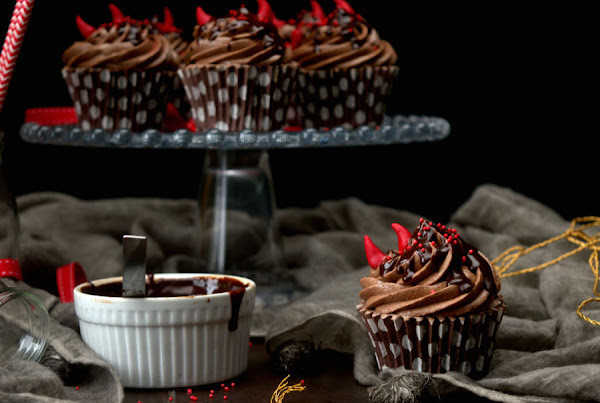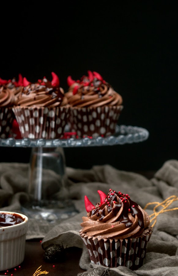 Para representar a este cuento, me decidí por unos cupcakes devils food. Nada mejor que la "comida del diablo" para que aparezcan en una fiesta de diablillos, ¡jeje! Una versión mejorada de los Devils Food cupcakes que hice hace mil para el Día de los Enamorados y donde te cuento el porqué de este curioso nombre. Si te interesa, pincha en el enlace anterior. Esta receta nueva la adapté del blog The crumby kitchen.