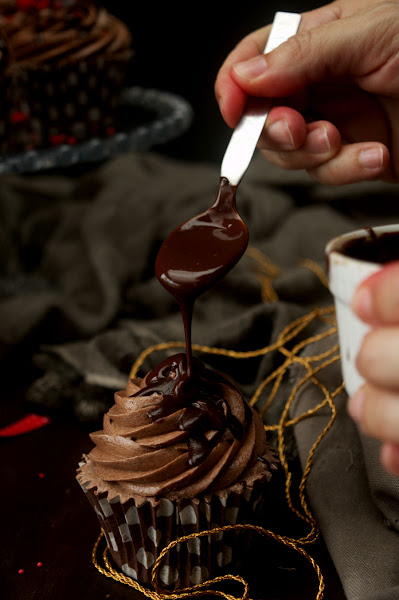 Make a hole in the center of the cupcakes, fill with the ganache, and cover with the piece of cake we have removed before.