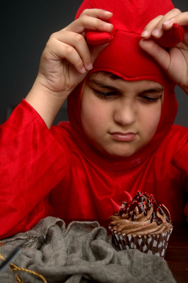 Y por supuesto, aparte de los cupcakes, con sus cuernecitos y todo, los cuáles han sido el objeto elegido este mes para que aparezca en la foto, no podía faltar mi diablillo pequeño. Con un disfraz de diablillo de hace dos años de Halloween, que ya no le quedaba muy bien pero que a la fuerza quería meterse. ¡Para comérselo!
