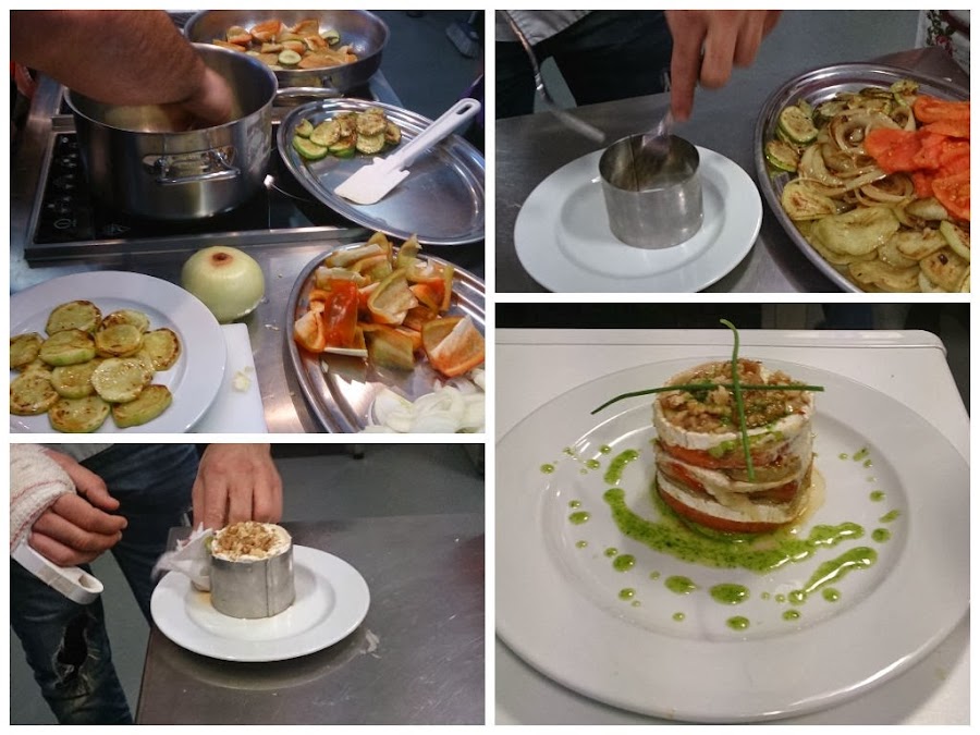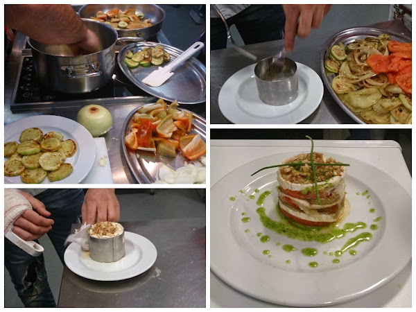 Para el timbal de verduras es necesario cebolla en aros, pimiento en rectángulos, tomate, berenjenas y calabacín todos en rodajas, queso de cabra (o el que sea de vuestro gusto) y nueces picadas (o cualquier fruto seco). Marcamos todas las verduras con un poco de aceite y su punto de sal. A continuación, montamos en un aro haciendo capas con las verduras y el queso, finalizando con una de queso de cabra y las nueces. Gratinar unos minutos, decorar con cebollino y aceite de ajo y perejil. Servir inmediatamente.