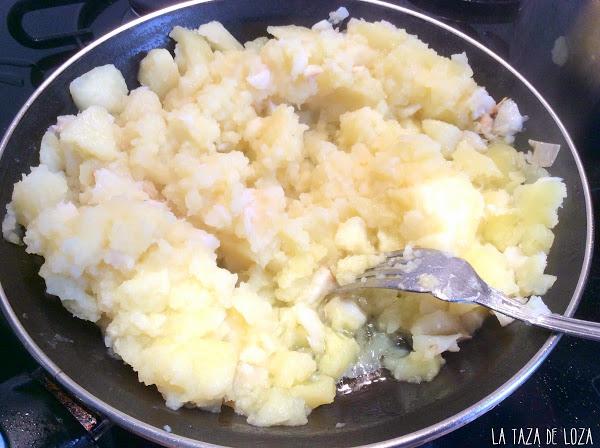 Se añaden a continuación las patatas, que machacaremos con un tenedor y mezclamos todo para que quede bien unido con el bacalao.