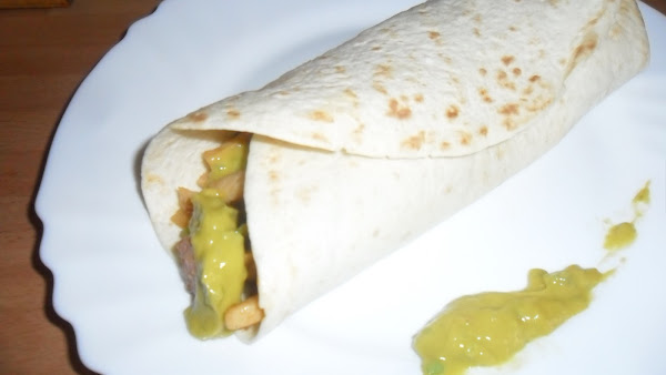 Calentamos las tortillas ligeramente en una sartén, rellenamos con la preparación, agregamos guacamole cantidad deseada y enrrollamos.