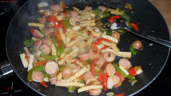 Rehogamos la cebolla a tiras, pimientos verdes y rojos todo en juliana, agregamos los dientes de ajos muy picaditos y una vez pochados agregamos la pechuga de pollo en tiras y las salchichas frescas a trocitos pequeños, seguir rehogando.