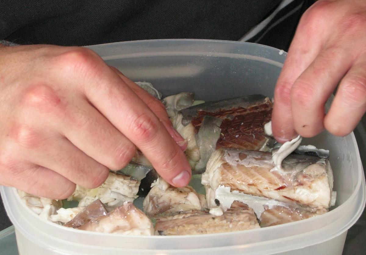 Se deja reposar el cazón para que enfríe un poco, se le retira la piel y se descarta, se desmenuza con las manos retirándolo de la espina central.