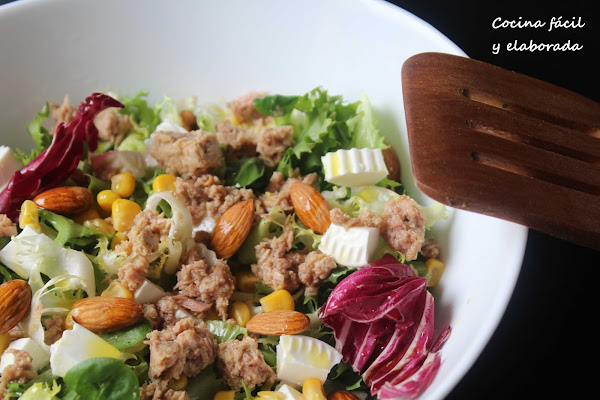 Ensalada de maíz, atún, queso fresco y almendras