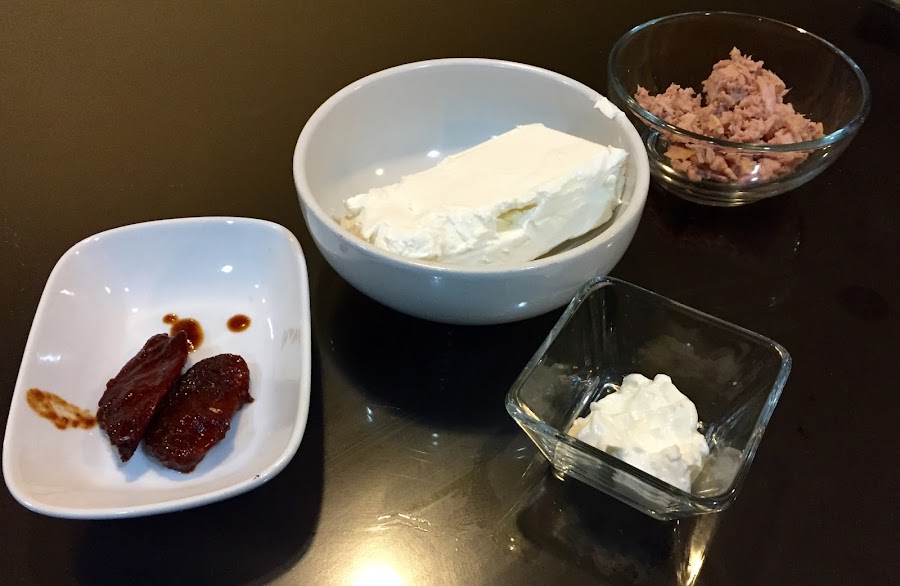 2.- Coloca en la licuadora el queso crema, los chiles chipotles, las cucharadas de media crema y el atún drenado.