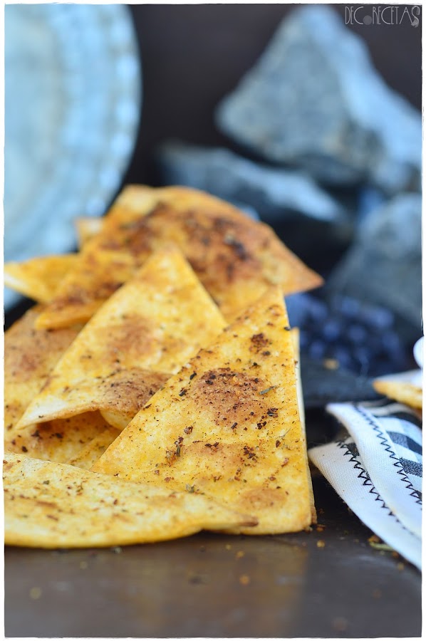 Realizamos los nachos caseros picantes, cortando en triángulos unas tortitas de maíz. Las untamos con ayuda de un pincel de la mezcla de medio vaso de aceite virgen extra junto con 2 cucharaditas de pimentón picante, una cucharadita de cebolla en polvo, y una cucharadita de hierbas secas al gusto. Metemos al horno a 200 grados con calor arriba y abajo durante 5 minutos, momento en el cual sacamos y dejamos enfriar para que endurezcan por completo