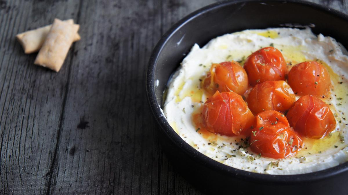 Servimos el dip de queso feta en un plato, cubrimos con los tomates asados y regamos con un chorrito más de aceite de oliva.