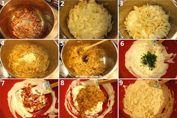 La receta es muy fácil, tan solo hay que cocinar el bacon y la cebolla y mezclarlo todo con crema de queso y nata (crema de leche) agria. Y el extra añadido viene cuando se gratina con queso Cheddar, ¿te lo vas imaginando, verdad?