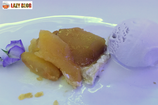 El drama va concluyendo y llegan los postres. Se trata de una riquísima tarta tatín de manzana, acompañada de helado de violeta, un sabor de caramelo típico madrileño, que encaja bien con el nombre de la protagonista.