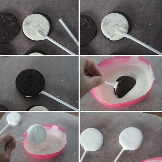 Separar la galletita. Sumergir el palito en chocolate derretido y pegarlo en la mitad que tiene el relleno, luego cerrar con la otra tapa y presionar apenas para que se peguen.